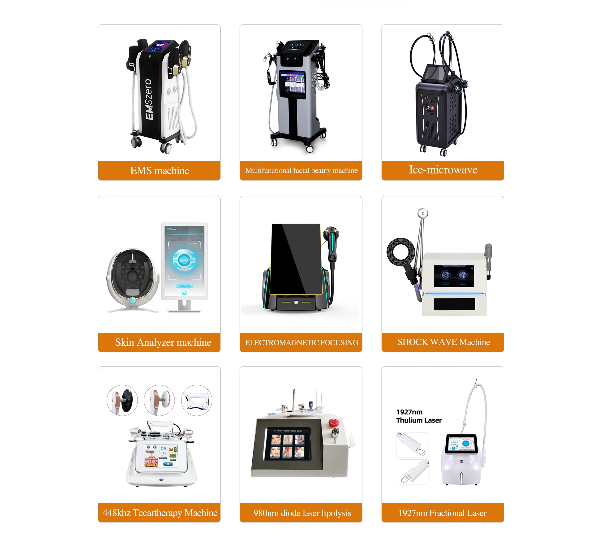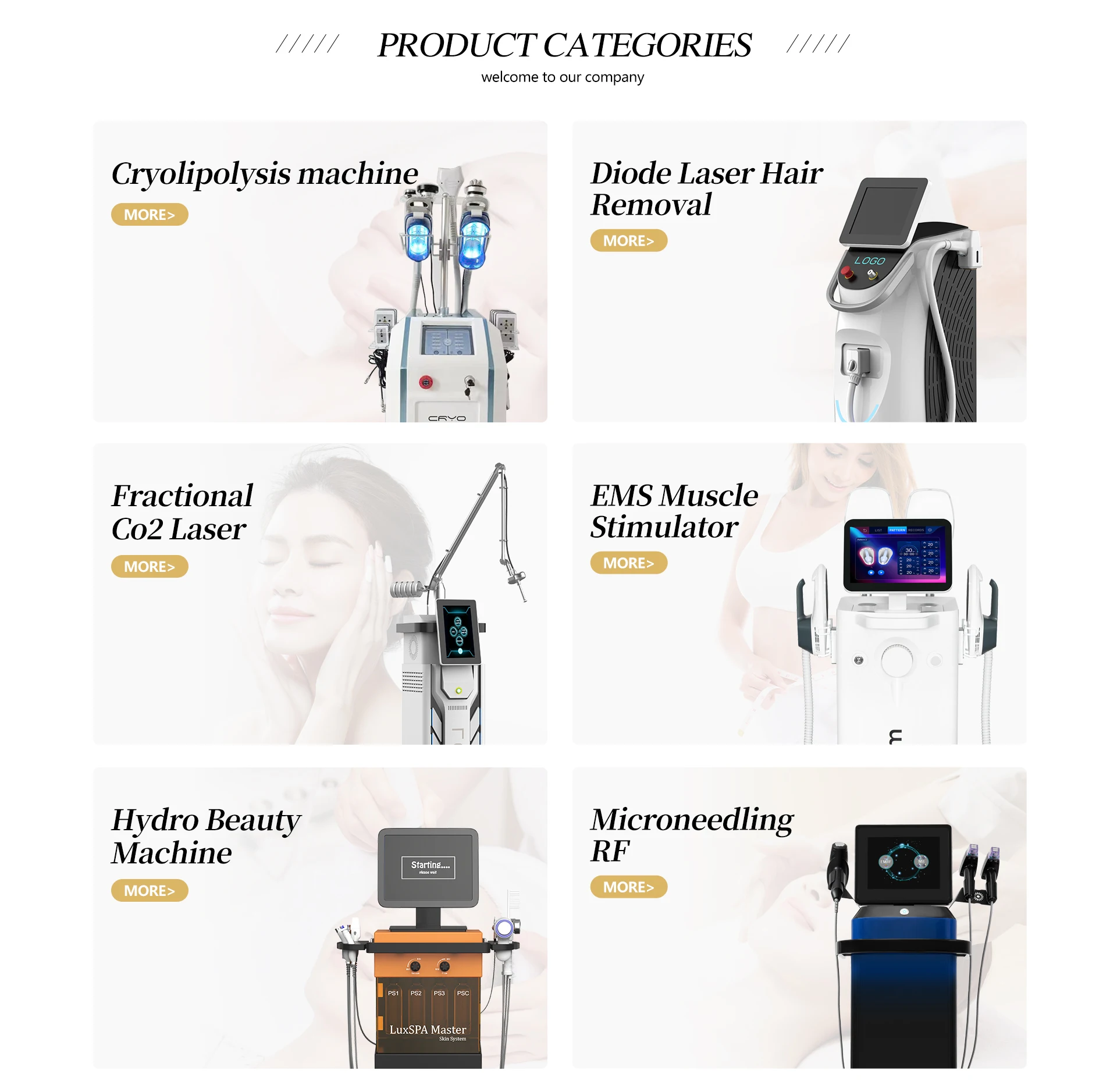 Main categories: Hair Removal Machine,Hifu Mchine,Cryolipolysis Machine,Hydra Beauty Machine,CO2 Fractional Laser Machine